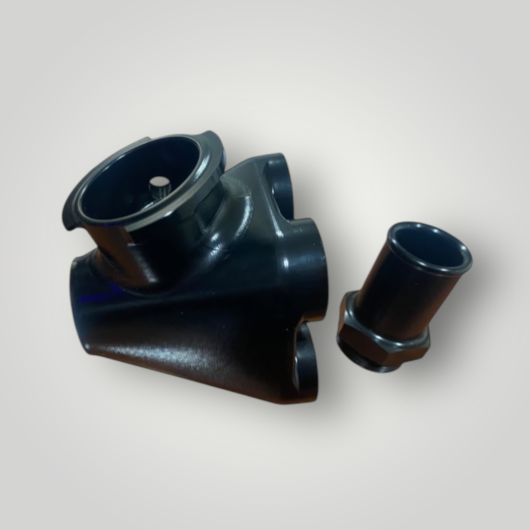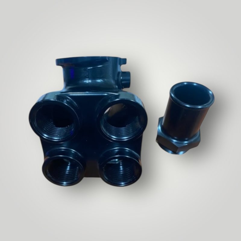 Billet 4 into 1 Water Manifold, with radiator cap and Four AN -12 inlet port and 1 AN -16 outlet port.